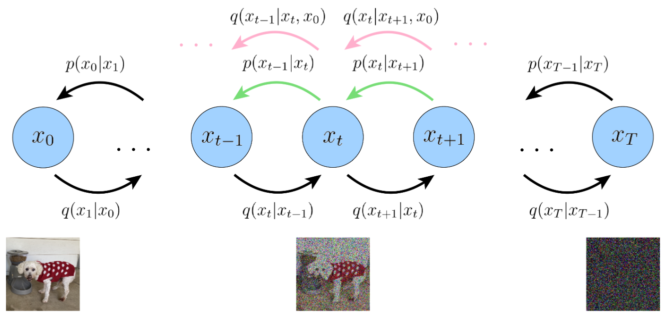 - 中间的 $T-1$ 项 $L_t$ ($1 \le t \le T-1$): 我们先考虑 $q(x_{t-1}|x_{t},x_{0})$ 这个概率分布,因为这是一个确定的分布,根据贝叶斯(Bayes)定理和前向过程定义的概率:
