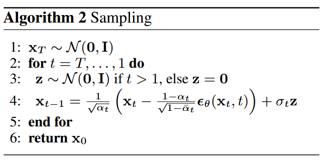 $$ \begin{aligned} & \ p_\theta(x_{t-1} | x_t) = \mathcal{N} \left(\frac{1}{\sqrt{\alpha_t}} \left( x_t - \frac{1 - \alpha_t}{\sqrt{1-\bar{\alpha}_{t}}} \varepsilon_\theta(x_t, t) \right), \frac{\beta_t(1-\bar{\alpha}_{t-1})}{1-\bar{\alpha}_t} I\right) \\ \Leftrightarrow \ & x_{t-1} = \frac{1}{\sqrt{\alpha_t}} \left( x_t - \frac{1 - \alpha_t}{\sqrt{1-\bar{\alpha}_{t}}} \varepsilon_\theta(x_t, t) \right) + \frac{\beta_t(1-\bar{\alpha}_{t-1})}{1-\bar{\alpha}_t} \varepsilon \end{aligned} $$所以在有当前时间步下的 $x_t$,就可以根据上述公式往前递推一步。用伪代码来总结一下整个的采样/推理流程: