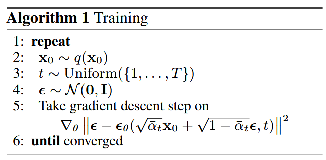 $$ \mathcal{L} = \mathbb{E}_{t, x_0, \varepsilon} \left[ \| \varepsilon_\theta(\sqrt{\bar{\alpha}_t} x_0 + \sqrt{1 - \bar{\alpha}_t} \varepsilon, t) - \varepsilon \|^2 \right] $$其中 $t \sim U(1, T)$。$t=1$ 的情况对应于$L_0$,就是离散解码器的情况,$t>1$ 的情况就是刚刚推导的 $L_t$。正如前面所说的,$L_T$ 与神经网络参数 $\theta$ 无关,所以就没有出现。