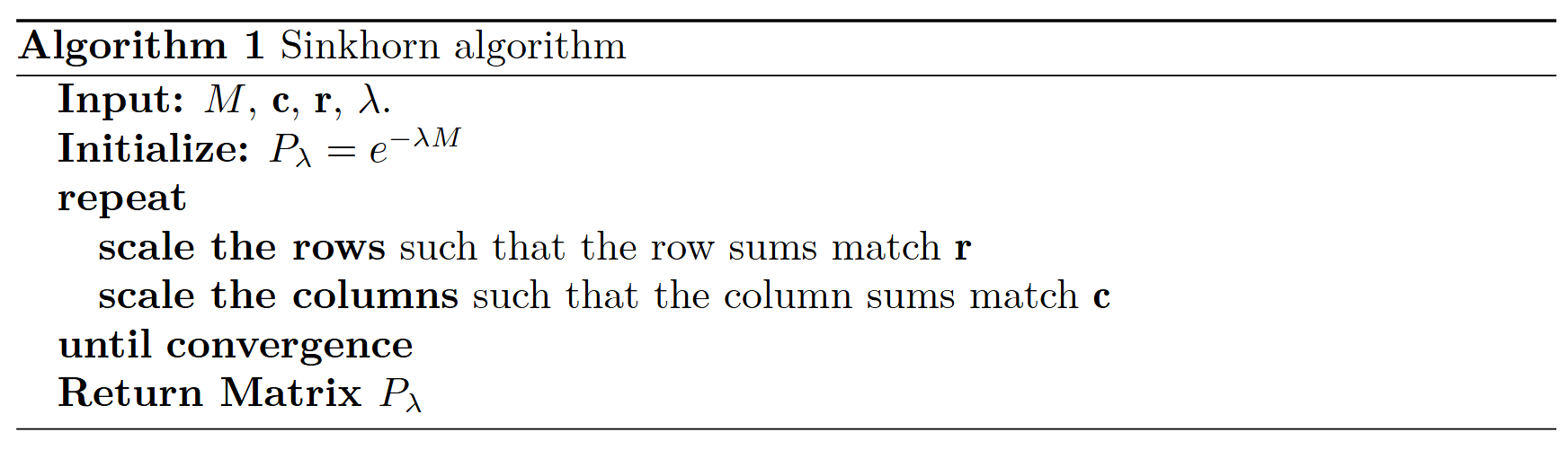 $$ P_{i,j} = \alpha_{i} \beta_{j} e^{-\lambda M_{ij}} $$最终的满足约束的 $P$ 的解可以通过下面这个伪代码和算法获得: