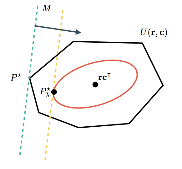 成本矩阵决定了分布的优劣方向。集合 $U(\mathbf{r}, \mathbf{c})$ 包含所有可行的分布。在未正则化的情况下,最优 $P^{\star}$ 通常在这样一个集合的某个角上。在添加熵正则因子时,我们将自己限制在熵最小的分布上,即位于平滑的红色曲线内。由于我们不必再处理 $U(\mathbf{r}, \mathbf{c})$ 的尖角,因此更容易找到最优值。特殊情况下,当 $\lambda \rightarrow \infty$ 时,$P_{\lambda}^{\star}$ 将变得越来越接近 $P^{\star}$(直到算法遇到数值困难)。另一方面,对于 $\lambda \rightarrow 0$ 的情况,只考虑熵项,$P_{\lambda}^{\star} = \mathbf{r} \mathbf{c}^T$(这是一种均匀分布,均匀分布信息熵最小)。